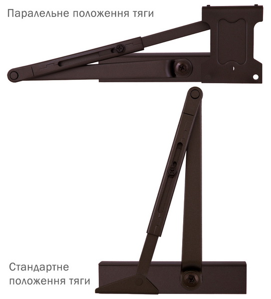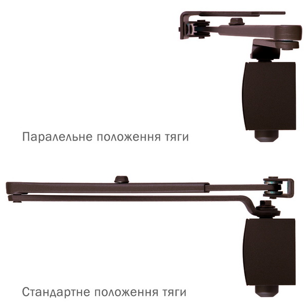 Не дивлячись на компактні розміри, дотягувачі серії D-1200 здатні працювати з дверима вагою до 80 кг та шириною стулки до 1100 мм. Компактність дотягувача забезпечує спосіб кріплення з прихованими кріпильними отворами. дотягач D-1200P UNIV комплектується універсальною тягою (стандартна + кронштейн паралельної тяги) та декоративною пластиковою кришкою. Монтаж дотягувача з паралельною тягою застосовується в разі необхідності встановлення дотягувача на дверному полотні (не на рамі), з протилежного боку дверних петель. Під час монтажу дотягувача D-1200 з кронштейном для паралельного положення тяги відносно дверей слід враховувати, що максимальна вага дверей повинна становити 60 кг, а ширина - 950 мм. Регулювання дотягувача за класом - EN 2/3/4 - здійснюється шляхом переміщення дотягувача по дверному полотну. Регульована початкова та кінцева швидкість зачинення дверей. Сертифікований згідно з EN 1154.